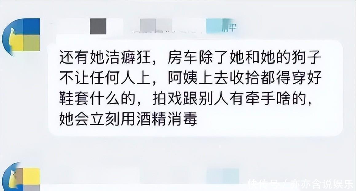 稍有不合规的举动便会被厉声斥责。同时她还有着严重到近乎病态的洁癖。在拍摄中与对手戏演员、工作人员发生肢体接触后,会立刻掏出酒精喷雾反复消毒,让合作方倍感尴尬。
